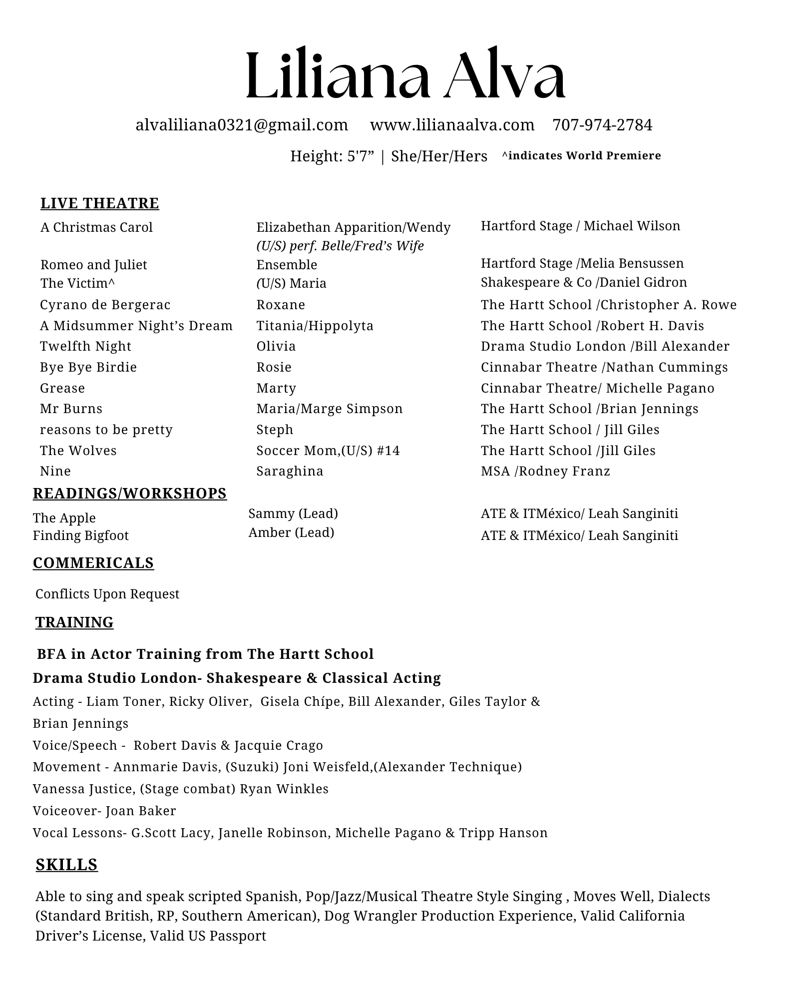 Hi! My name is Liliana Alva. I am a Peruvian-American actor based in New York City from Northern California. I am a versatile storyteller who has a passion for connection and performance.